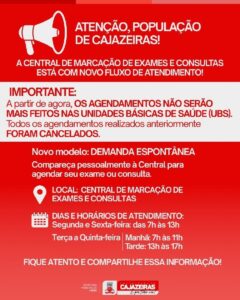 A Prefeitura Municipal de Cajazeiras, por meio da Secretaria de Saúde, está comunicando que a Central de Marcação de Exames e Consultas está com um novo fluxo de atendimento à população.