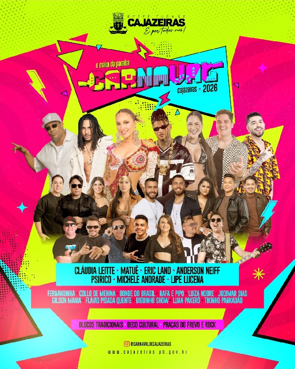 Em live realizada no final da tarde desta terça-feira (23), a prefeita de Cajazeiras, Corrinha Delfino, anunciou o restante das atrações do Carnaval 2026, fechando oficialmente a programação do maior evento popular do município.